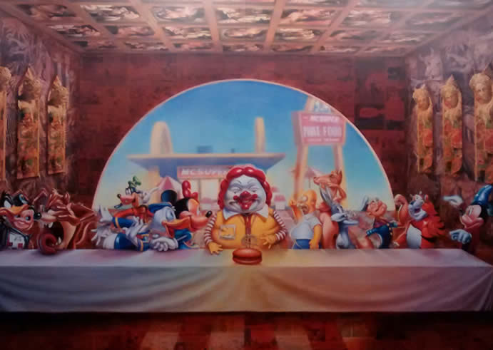 Ron English mistura em seu trabalho referências pop, da história da arte, da propaganda, dos quadrinhos e da música. Além de murais, fotografias e quadros, você também poderá ver o documentário POPaganda: The Art and Crimes of Ron English, muito interessante sobre a história do artista e suas motivações para a criação de suas obras, dirigido pelo espanhol Pedro Carvajal.